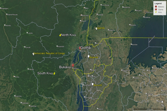 नोट: संघर्ष के क्षेत्र डीआरसी के उत्तरी किवु (गोमा) और दक्षिण किवु (बुकवु) हैं, जो रवांडा, युगांडा और बुरुंडी की सीमा से लगे हैं।