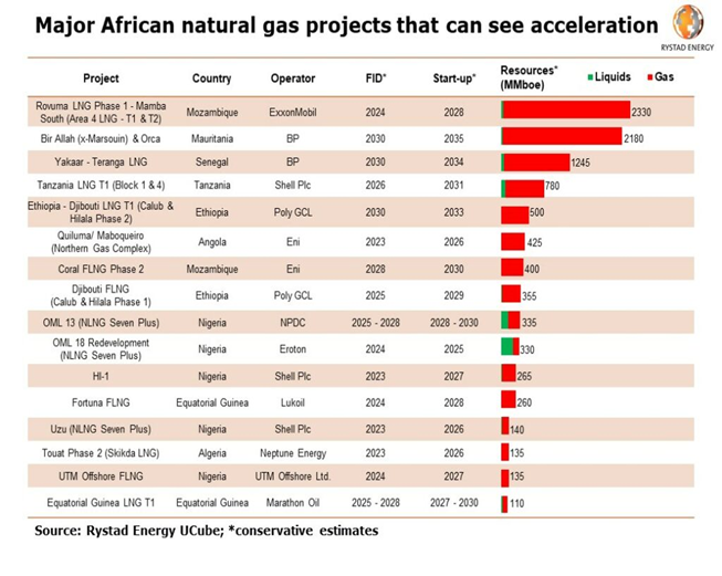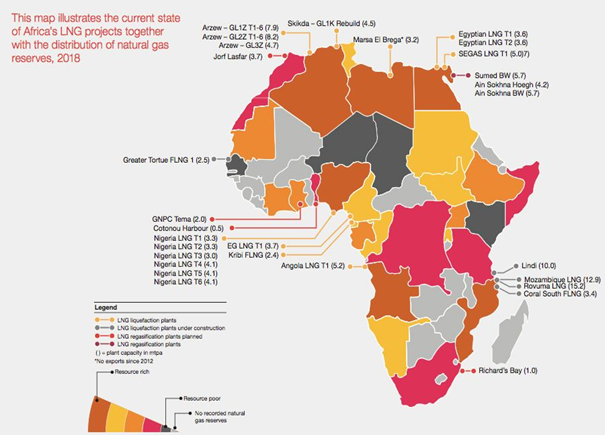 अफ्रीका के मौजूदा फायदे हैं जो इसे यूरोप की ऊर्जा जरूरतों को पूरा करने के लिए विशिष्ट रूप से सक्षम बनाता है। अफ्रीका में अनुमानित 221.6 ट्रिलियन क्यूबिक फीट प्राकृतिक गैस भंडार है जो यूरोप के ऊर्जा संकटों अच्छी तरह से सुधार सकता है। अफ्रीका में; नाइजीरिया, अल्जीरिया और मोजाम्बिक में अधिकांश भंडार हैं।