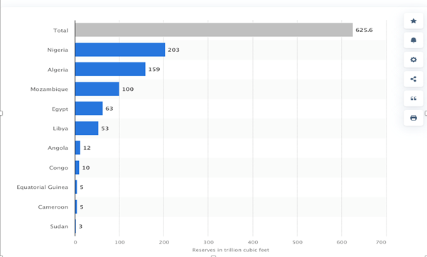 2021 तक अफ्रीका में प्राकृतिक गैस भंडार (ट्रिलियन क्यूबिक फीट में)