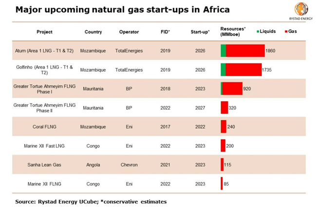दो महत्वपूर्ण परियोजनाएं जो जल्द ही यूरोप की गैस आवश्यकताओं में योगदान दे सकती हैं, वे हैं सेनेगल और मॉरिटानिया के बीच समुद्री सीमा पर स्थित 'टोर्ट्यू डेवलपमेंट', जो 2023 तक चालू हो जाएगा, और कैमरून में 'हिली एपिसेयो' परियोजना, जिसका नाम एक कंपनी द्वारा संचालित है। पेरेंको ने आगे पुष्टि की है कि वह 2023 में परियोजना से उत्पादन बढ़ाने की योजना बना रहा है22। जबकि ऊर्जा परियोजनाओं को चालू होने में समय लगता है, इन दो परियोजनाओं अर्थात, टोर्टू डेवलपमेंट और हिली एपिसेओ के साथ लाभ यह है कि वे अगले कुछ माह के भीतर चालू हो जाएंगी। इस प्रकार, यूरोप की अल्पकालिक ऊर्जा आवश्यकताओं का कुछ हद तक समाधान किया जा सकता है। इसके अलावा, यूरोपीय ऊर्जा की बड़ी कंपनियों द्वारा संचालित कई आगामी ऊर्जा स्टार्ट-अप और प्राकृतिक गैस परियोजनाओं के कारण अफ्रीका की क्षमता को और बढ़ाया गया है, जिनके त्वरण के परिणामस्वरूप यूरोप में ऊर्जा वितरण में वृद्धि हो सकती है।