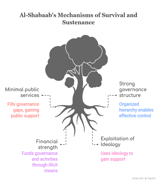 अपनी आज़ादी के बाद से, सोमालिया को कई समस्याओं का सामना करना पड़ा है, जिनमें अत्यधिक भ्रष्टाचार, उचित शासन का अभाव, कबीलों के बीच प्रतिद्वंद्विता, गरीबी, सूखा, अकाल और अपने औपनिवेशिक अतीत के परिणामस्वरूप विदेशी शक्तियों के प्रति अविश्वास शामिल है। अल-शबाब ने अपने अस्तित्व के लिए इन समस्याओं का लाभ उठाने की कोशिश की है। आईसीयू से अलग होने और एक अलग इकाई बनने के बाद से, इस समूह ने विभिन्न राजनीतिक, सामाजिक-आर्थिक और वैचारिक तरीकों से खुद को बनाए रखा है, बावजूद इसके कि उसे वर्षों तक सोमाली राष्ट्रीय सेना और अफ्रीकी संघ समर्थक बलों के कड़े प्रतिरोध का सामना करना पड़ा।
