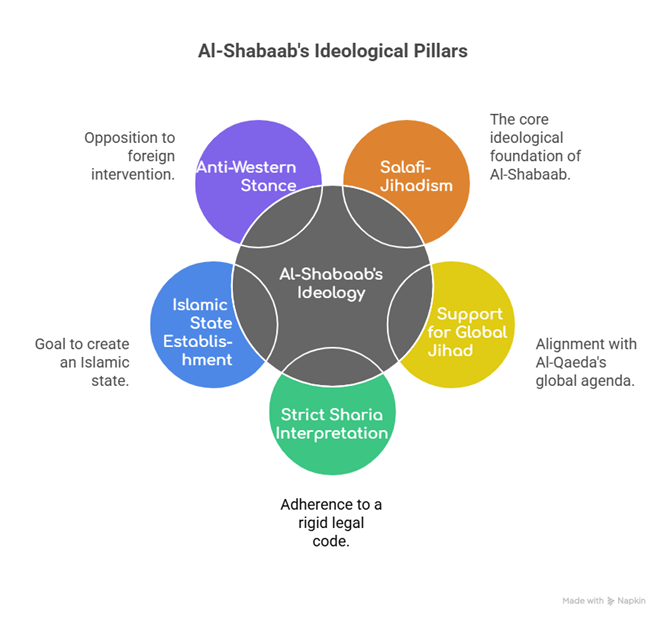 यह समूह धार्मिक प्रवचनों और शिक्षा, मदरसों/इस्लामी संस्थानों और एक बुष विश्वविद्यालय का उपयोग विचारधारा को उत्पन्न करने, अपने दृष्टिकोण को दोहराने वाले मौलवियों और कानूनविदों का उत्पादन करने, और सदस्यों और समुदायों के बीच आंतरिक वैधता बनाने के लिए करता है। अल-शबाब का विचारधारा का उपयोग इसके स्थायित्व में योगदान देने वाला एक अन्य मजबूत यंत्र के रूप में कार्य करता है।[xxvii]