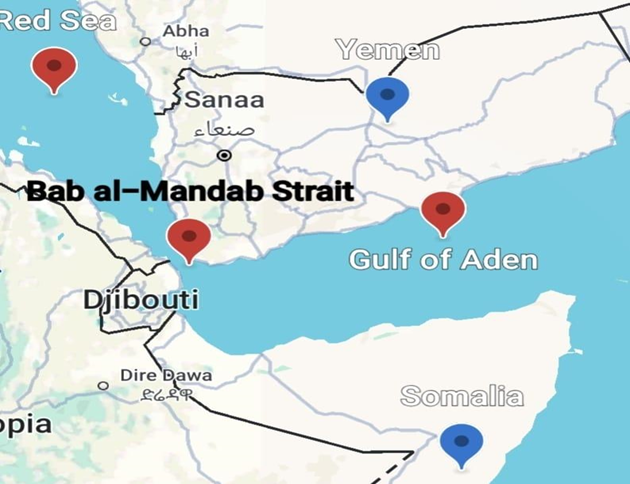 अदन की खाड़ी और लाल सागर के बीच बाब-अल-मन्देब जलडमरूमध्य की रणनीतिक स्थिति।