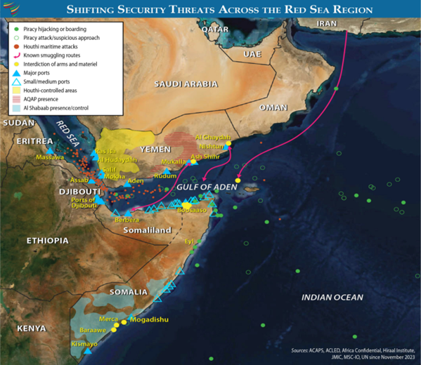विस्तृत क्षेत्र जिसमें लाल सागर, अदन की खाड़ी, अफ्रीका की सिंग और पश्चिमी हिंद महासागर शामिल हैं, मई 2025 तक अल-शबाब और हूतियों द्वारा व्यापार में रुकावटों, हमलों और समुद्री डकैती की घटनाओं का सामना कर रहा है।