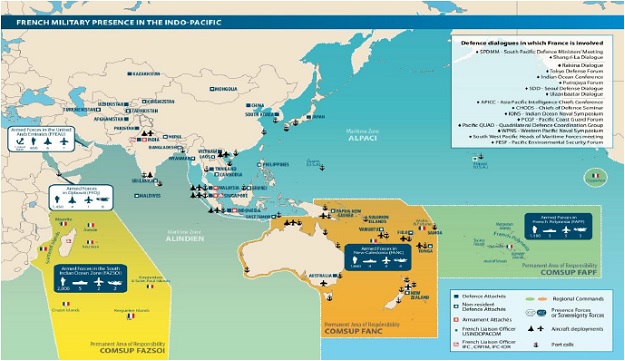 सशस्त्र बलों के फ्रांसीसी मंत्रालय द्वारा मई 2019 में प्रकाशितद फ्रांस एंड सिक्यूरिटी इन दइंडो-पैसिफिक में इस बात पर जोर दिया गया है कि फ्रांस में लगभग 9 मिलियन कि.मी.2 ईईजेड है,1.6 मिलियन फ्रांसीसी नागरिक फ्रांसीसी विदेशी महकमे और क्षेत्रों में रहते हैं। फ्रांस ने विदेशी सैन्य बलों और स्थायी सैन्य आधार को हिन्द-प्रशांत महासागरक्षेत्रमें रहने वाले लोगों की सुरक्षा जिम्मेदारियों को पूरा करने के लिए तैनात किया हैl12